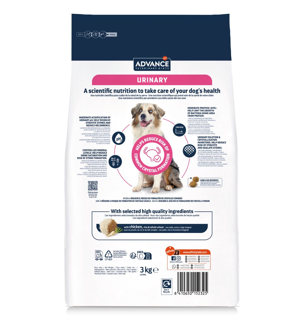 O ADVANCE VETERINARY DIETS URINARY é um alimento dietético completo para cães, formulado com um teor moderado de magnésio e propriedades acidificantes da urina, indicado para reduzir o reaparecimento de cálculos de estruvita na urina. Graças ao seu delicioso sabor, é o alimento diário ideal para os cães com tendência a sofrerem de problemas de cristais de estruvita.