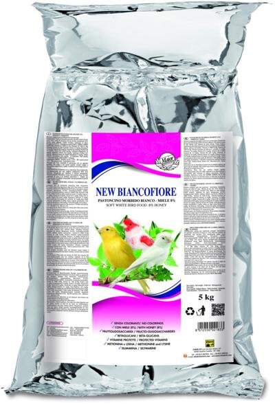 BIANCOFIORE é uma papa macia sem colorantes, com mel 8% e sem ovos, porque podem dar colorações indesejadas. Contém FRUTOLIGOSACÁRIDOS para uma melhor regulação da fl ora bacteriana, BETAGLUCANOS para estimular o sistema imunológico, VITAMINAS PROTEGIDAS, METIONINA, LISINA e SILIMARINA, conhecida pela sua actividade regeneradora e de protecção do fígado.