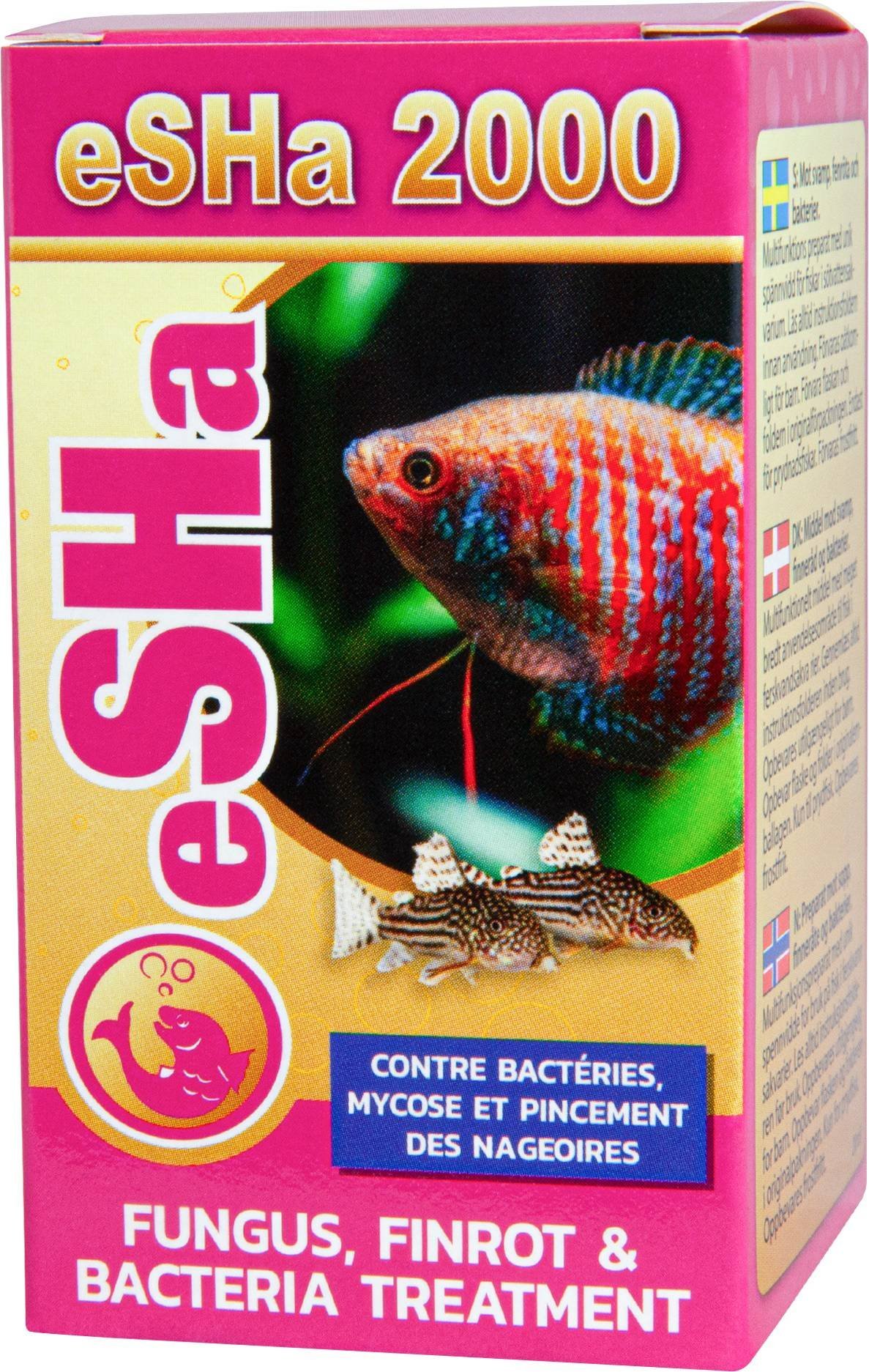 eSHa 2000 trata um grande espectro de doenças fungícas, bacterianas e infecções parasitárias, acelera a recuperação de feridas e protege a camada de pele. Use eSHa 2000 para Fungos, Dropsy, bactérias, problemas de pele, problemas de guelras, úlceras e feridas. Também para a doença dos Neon Tetra e muito mais.