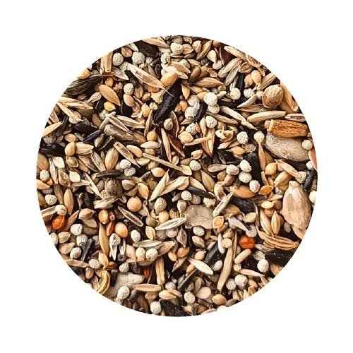 Alpista, níger, perilha, milho alvo vermelho, milho alvo japonês, milho alvo branco, girassol micro preto, painço, linhaça, cânhamo, miolo de girassol, cardo maria, chicória, luzerna, alface, gramíneas, sésamo, papoila, funcho.