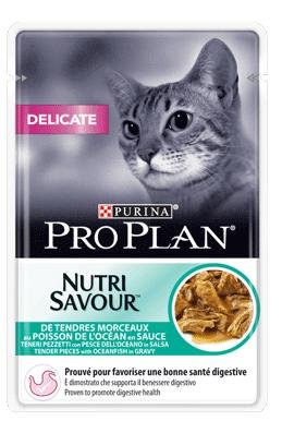 PRO PLAN® NUTRISAVOUR™ DELICATE com Peixe do Oceano é um alimento húmido completo e equilibrado para gatos adultos com digestão sensível e/ou pele delicada, que combina a nutrição que deseja com o sabor que ele adora. Contém todos os nutrientes essenciais, incluindo um prebiótico que está provado em como promove a saúde digestiva. E é altamente digerível graças à elevada qualidade dos ingredientes, e ajuda a reduzir possíveis reações cutâneas associados à sensibilidade alimentar.